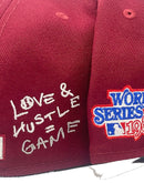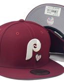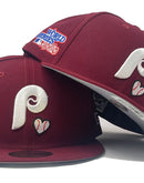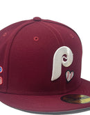 Philadelphia Phillies Team Heart 59FIFTY Fitted Cap features an embroidered Phillis logo and heart shaped baseball at the front panels with a 1986 World Series patch at the right-wear side. Additional details include the MLB Batterman logo with an embroidered quote at the rear and a gray under visor.