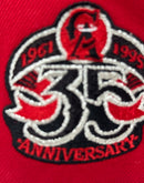 Discover the epitome of style and sport with our Los Angeles Angels 35th Anniversary Snapback Hat. Crafted with precision and passion, this 9FIFTY New Era snapback cap is a testament to your love for the game. With its vibrant all-red color cap with black visor design accented by a striking red with black and white outline, it's a statement piece that exudes confidence and team pride. The iconic 35th anniversary side patch adorns the left mid-panel, commemorating the rich history of the team and stadium.
