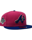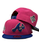 Step up your game with the Atlanta Braves 1995 World Series 9Fifty New Era Snapback Hat. This vibrant snapback cap is a must-have for any Braves fan or hat collector. Crafted with meticulous attention to detail, this hat showcases a striking hot pink color complemented by a royal blue visor, making it an eye-catching addition to your collection. The iconic Atlanta Braves front logo in royal blue with a metallic silver outline adds a touch of sophistication, celebrating the memorable 1995 World Series. The white New Era flag on the right mid-panel and the 1995 World Series side patch further enhance the hat’s appeal, making it a standout piece.