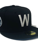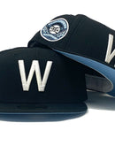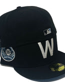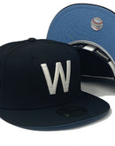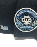 Represent your team with Black Washington Senatores 1924 world series custom 59fifty New Era fitted hat from Sports World. 59Fifty high crown with icy blue under visor. Front old school washington senatores logo in white. 1924 all star game side patch in sky, white with metallic silver outline. White sweatband. 100 percent polyester. Imported from Bangladesh.