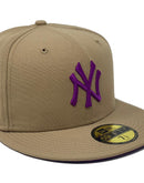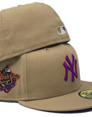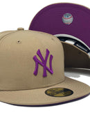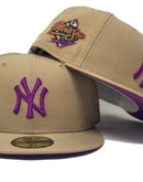 Custom new era fitted hat. all tan color cap. front logo in purple. 1998 world series side patch in metallic copper, purple, green. matching MLB batter man in the back. purple under visor and white sweat band.