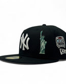 Classic black cap with white Yankees logo and Statue of Liberty logo on front right panel