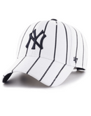 New York Yankees white pin stripe 47 mlb hat, features a velcro strap for full adjustibility alongside yankees script logo on velcro. Navy blue under visor and classic yankee logo.