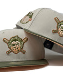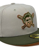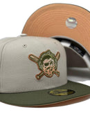 Presenting an exclusive rare masked pirates hat only from Sports World. 59Fifty high crown cap. It features an all stone color cap with olive green visor. from logo in olive, metallic copper with peach outline. established pirates side patch on right mid panel. tonal new era flag on left mid panel. alternate pirates logo in the back. peach under visor. white sweat band. 100 percent polyester. imported from China.