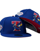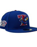 This 59Fifty high crown cap features a unique and stylish design, with an all-light royal blue color cap. The front logo is in red, royal blue with white outline, making it stand out from other Blue Jays hats. The 20th-anniversary side patch on the left mid-panel adds a special touch to the hat, while the tonal New Era flag on the right mid-panel completes the design.