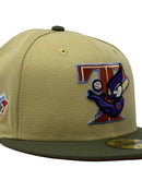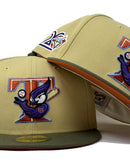 Presenting an exclusive Toronto Blue Jays 20th anniversary custom New Era fitted hat from Sports World. 59Fifty high crown cap. It features all vegas gold color crown with olive green visor. front logo "T" in rust orange, Bird logo in purple. Baseball bat in metallic gold. 20th anniversary side patch in left mid panel. tonal new era flag on right mid panel. Flat MLB batter man in the back. rust orange under visor. white sweat band. 100 percent polyester. imported from China.