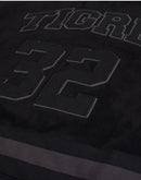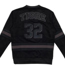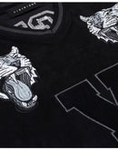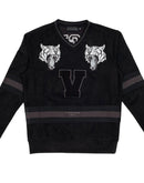 Microfiber suede v-neck sweater with embroidery felt patch appliques and overlay stripe details on sleeves and body.
