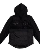 Mixed media color blocked hooded pull over jacket with patch appliques on chest and sleeves, zippered stow pockets, printed logo on chest and back and elastic draw cord pullers at waist.