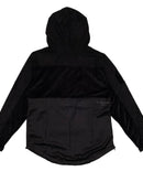 Mixed media color blocked hooded pull over jacket with patch appliques on chest and sleeves, zippered stow pockets, printed logo on chest and back and elastic draw cord pullers at...