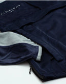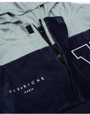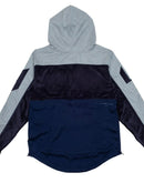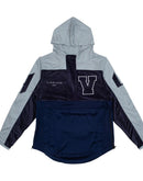 Mixed media color blocked hooded pull over jacket with patch appliques on chest and sleeves, zippered stow pockets, printed logo on chest and back and elastic draw cord pullers at waist.