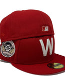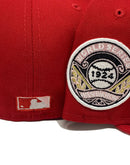 Custom New Era fitted hat. all red color cap. front logo in white. 1924 world series side patch. Flat MLB batter man in the back. Flat MLB batter man in the back. pink under visor. white sweat band. 100 percent polyester.