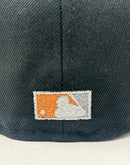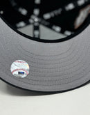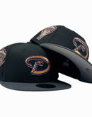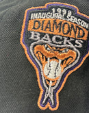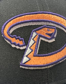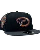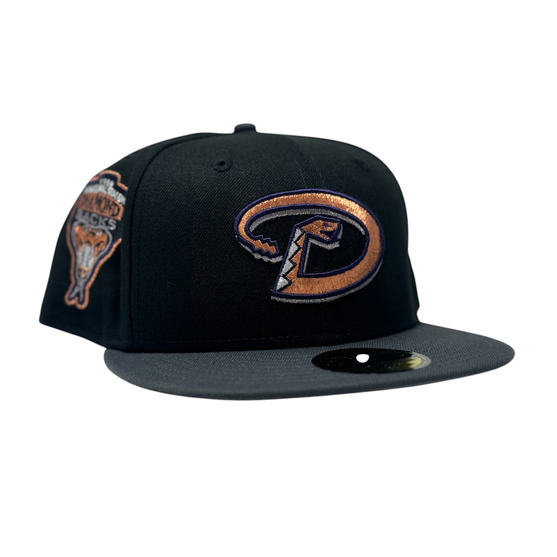 This 59Fifty high crown cap features a unique and stylish design, with an all-black color cap with dark gray visor. The front logo in metallic black with metallic copper, purple and metallic silver outline, making it stand out from other Diamondbacks hats. The Inaugural season 1998 side patch on the left mid-panel adds a special touch to the hat, while the tonal New Era flag on the right mid-panel completes the design.