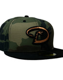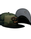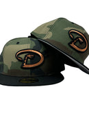 This 59Fifty high crown cap features a unique and stylish design, with an all camo green color cap. The front logo in metallic copper with black outline, making it stand out from other Diamondbacks hats. The black New Era flag on the right mid-panel completes the design.