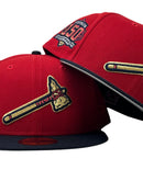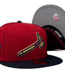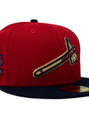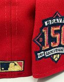 Introducing the Atlanta Braves 150th anniversary New Era Fitted Hat, a must-have accessory for all Braves fans. This high-quality hat is designed to provide a comfortable and stylish fit while representing your favorite MLB team. The intricate embroidery on this hat is unmatched and highlights the team's logo on the front panels, 150th anniversary Side patch, and an MLB batter man in the back.