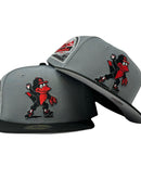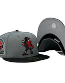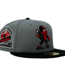 The hat is made of high-quality polyester and features a sleek all-dark gray color crown design with a black visor. The front of the hat features a red and black logo with metallic silver outline, and the left mid panel has a 30th anniversary side patch in black, red, metallic pewter, and metallic silver. The back of the hat has a flat MLB Batterman logo.