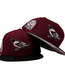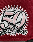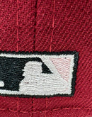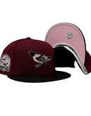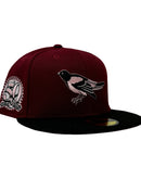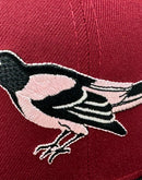 The hat is made of high-quality polyester and features a sleek all-burgundy color crown with a black visor. The front of the hat features the Orioles bird logo in black white and light pink and the left mid panel has a 50th anniversary side patch in black, pink and white. The back of the hat has a flat MLB Batterman logo.