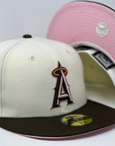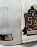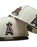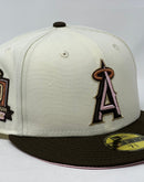 Presenting an exclusive custom Los Angeles Angels New Era fitted hat only from Sports World. 59Fifty high crown cap. it features an all-off white/ chrome color cap with brown visor. from "A" logo in brown and pink with camel outline. metallic copper hallo. 50th Angel's stadium anniversary side patch on right mid panel in camel, brown and metallic copper. tonal new era flag on left mid panel. flat MLB batter man in the back. pink under visor. white sweat band. 100 percent polyester. imported from China