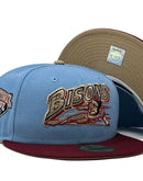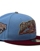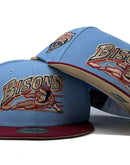 Presenting an exclusive custom New Era fitted hat from Sports world. 59Fifty high crown cap. it features an all-sky color cap with burgundy visor. front Bisons logo in toast, navy and burgundy. International League side patch on left mid panel. tonal new era flag on right mid panel. Raised MILB batter man in the back. camel under visor. white sweat band. 100 percent polyester. imported from China.