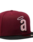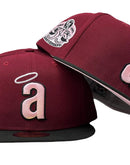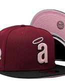 Introducing a unique custom Los Angeles Angels pink brim New Era fitted hat from Sports World. The 59Fifty high crown fitted hat is designed with a sleek all burgundy color cap with black visor that provides a bold contrast to the classic design.