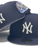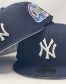 Navy Blue New York Yankes Subway Series On Field New Era fitted hat. 59Fifty high crown cap. It features an all-navy blue color cap. Front logo in white. On field subway series side patch on left mid panel. Flat MLB batter man in the back. Gray under visor. White sweat band. 100 percent wool. Imported from Bangladesh.