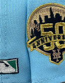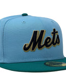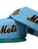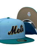 Introducing a unique custom New York Mets camel brim New Era fitted hat from Sports World. The 59Fifty high crown fitted hat is designed with a sleek all sky-blue color cap with turquoise visor that provides a bold contrast to the classic design.