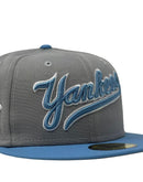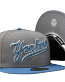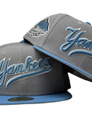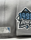 Introducing a unique custom New York Yankees 1999 world series gray brim New Era fitted hat from Sports World. The 59Fifty high crown fitted hat is designed with a sleek all light gray color crown with sky blue visor that provides a bold contrast to the classic design.