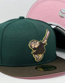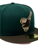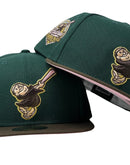 Presenting an exclusive San Diego Padres 40th anniversary custom New Era fitted hat only from Sports World. 59Fifty high crown cap. it features a green color cap with brown visor. front logo in brown and peach with metallic gold outline. Baseball bat in pink with brown outline. 40th anniversary side patch on left mid panel. tonal new era flag on right mid panel. flat MLB batter man in the back. pink under visor. white sweat band. 100 percent polyester. imported from China.