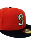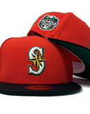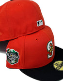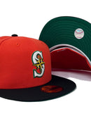Presenting an exclusive custom New Era fitted hat from Sports World. 59fifty high crown cap. it features an all-orange color crown with black. front logo in white with black and green outline. 2023 all-star game side patch on left mid panel. tonal new era flag on right mid panel. Flat MLB batter man in the back. green under visor. white sweat band. 100 percent polyester. imported from China.