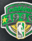 Elevate your game-day style with our meticulously crafted Boston Celtics 1946 establishment New Era Fitted Hat. Sporting an iconic design, this custom-fitted cap embodies the spirit of the Celtics with its vibrant all black color cap. The prominent team original spell out logo adorns the front in metallic green with metallic gold. 1946 establishment side patch proudly displays the team's illustrious history on the left mid-panel. Tonal New Era flag detailing on the right mid-panel adds a touch of modern flair, seamlessly blending tradition with contemporary aesthetics. Complete with the NBA logo man at the back, a gray under visor for added contrast, and a comfortable black sweatband, this hat is crafted for true Celtics enthusiasts who demand both style and quality.