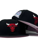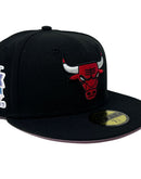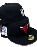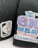 Presenting an exclusive New Era global collection release. 59Fifty high crown cap. it features all black color cap. team original logo in front. colorful 6x championship side patch on right mid panel. white new era flag on left mid panel. Raised NBA logo man in the back. pink under visor. pink sweat band. 100 percent polyester. imported from Bangladesh.