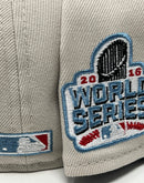 The hat showcases an understated yet striking design, featuring an all- stone color cap with a sky blue visor that adds a pop of color to the overall look. The front of the cap proudly displays the iconic Bear logo in a captivating combination of brown, black, and royal blue, representing the Cubs' formidable spirit. Additionally, the left mid-panel boasts an 2016 world series side patch, symbolizing the team's triumphant journey to baseball glory.