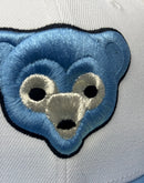 The hat showcases an understated yet striking design, featuring an all-white color cap with sky blue visor that adds a pop of color to the overall look. The front of the cap proudly displays the iconic Bear logo in a captivating combination sky blue, metallic silver with white outline representing the Cubs' formidable spirit. Additionally, the left mid-panel boasts a Be Alert Foul ball side patch.