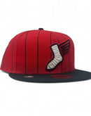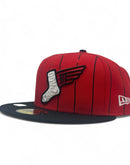 This 59Fifty high crown cap features a unique and stylish design, with an all-red color cap with black pinstripe on the crown and a contrasting black visor. The front logo in black and white with red outline, making it stand out from other White sox hats.