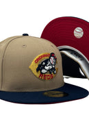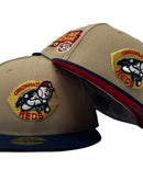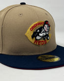 Introducing a unique custom Cincinnati Reds red brim new era fitted hat from Sports World. The 59Fifty high crown fitted hat is designed with a sleek all-Camel color cap with navy blue visor. The front logo in metallic gold, black and red is the perfect representation of the team, giving it a modern and stylish appeal that any Reds fan would love.