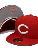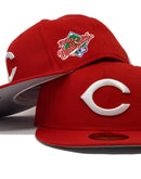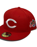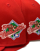 Custom new era fitted hat. all red cap. front logo in white. 1990 world series side patch. Flat MLB batter man in the back. gray under visor. white sweat band. it features 100 percent polyester.
