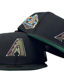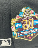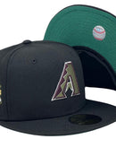 Presenting an exclusive Global Release " Botanical Pack" Arizona Diamondbacks 20th anniversary green brim New Era fitted hat. 59Fifty high crown cap. It features all black color cap. front logo in olive green with burgundy outline. 20th anniversary side patch on left mid panel, Botanical pattern on top of the 20th anniversary side patch. white new era flag on right mid panel. flat MLB batter man in the back. green under visor. black sweat band. 100 percent polyester. imported from Bangladesh.