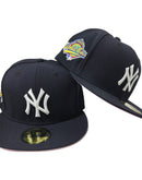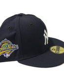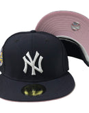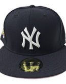 Exclusively designed new york yankees new era 59fifty fitted hat, 1996 world series patch, pink bottom, white sweatband, navy hat.