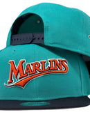 Presenting an exclusive Florida Marlins new era hat. 9 fifty new era snapback cap. it features all teal color cap with navy blue visor. front logo in orange with navy and white outline. 10th anniversary side patch on left mid panel. tonal new era flag on right mid panel. Adjustable bar tack in the back. gray under visor. white sweat band. 100 percent polyester. imported from China.