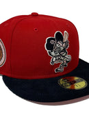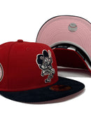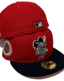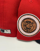 Rep your team with custom New Era fitted exclusively at Sports World. it features all red color crown with black corduroy visor. front tiger logo in black, white and pink. baseball bat in metallic copper. 1968 world series side patch on metallic copper. fronts are in light pink with black and white outline. flat MLB batter man in the back in light pink and black. pink under visor. white sweat band. crown in 100 percent polyester and 100 percent cotton.