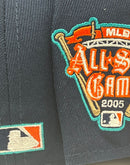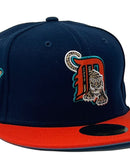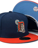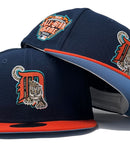Presenting an exclusive custom Detroit Tigers 2005 all-star game New Era fitted hat from Sports World. 59Fifty high crown cap. It features all oceanside blue crown with orange visor. Front logo in orange, teal with metallic gold and white outline. 2005 all-star game side patch in right mid panel. Tonal New Era flag on left mid panel. Flat MLB batter man in the back. sky blue under visor. White sweat band. 100 percent polyester. Imported from China.
