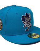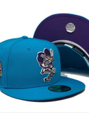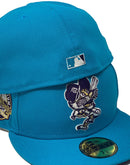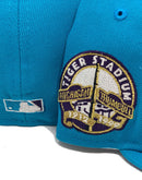 Rep your team with custom new era fitted exclusively at sports world. 59fifty high crown new era fitted hat. all aqua blue cap. front logo in purple with yellow outline. tiger stadium side patch. flat MLB batter man in the back. purple under visor. white sweat band. 100 percent polyester. imported from Bangladesh.