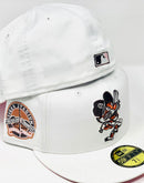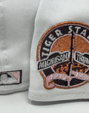 Presenting White Detroit Tigers custom new era fitted hat from sports world. 59Fifty high crown and pink under visor. Front tiger face logo in brown, orange and white mixture. Tiger stadium side patch. White sweatband. 100 percent cotton. Imported from Bangladesh.