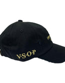 All black cap adjustable dad hat by field grade. front logo gold raised enbroidered. VSOP side patch in mettalic gold.