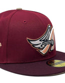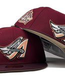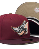 Presenting an exclusive Anaheim Angels "Shade of burgundy" collection New Era fitted hat from Sports World. 59Fifty high crown cap. it features an all-burgundy color cap with maroon visor. front logo in peach, black and white with metallic copper outline. 40th anniversary side patch on left mid panel. tonal new era flag on right mid panel. flat MLB batter man in the back. camel under visor. white sweat band. 100 percent polyester. imported from China.