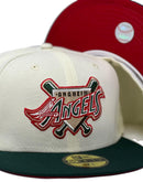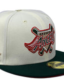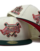 Presenting an exclusive custom New Era fitted hat only from Sports World. 59Fifty high crown cap. it features an all off white color cap with dark green visor. from logo in toast, green and red. Baseball bat in green with red outline. 50th anniversary side patch on right mid panel in green, red with toast. tonal new era flag on left mid panel. flat MLB batter man in the back. red under visor. white sweat band. 100 percent polyester. imported from China.