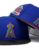 Presenting an exclusive custom New Era fitted hat only from Sports World. 59Fifty high crown cap. it features an all-royal blue color cap with black visor. from logo in Kelly green and purple with light pink and black outline. halo in Chevrolet gold. with peach outline. 50th anniversary side patch on right mid panel in pink, purple, Kelly green and white outline. tonal new era flag on left mid panel. flat MLB batter man in the back. sparkling grape under visor. white sweat band. 100 percent polyester. imported from China.