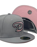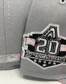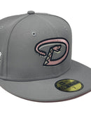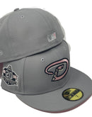 Rep your team with a custom New era fitted hat exclusively from Sports World. 59Fifty high crown cap. it features an all light gray cap. front Snake logo in pink with black and light pink outline. 20th anniversary series side patch in the mid panel inΒ pink, black and white. flat MLB batter man in the back. pink under visor. white sweatband. 100 percent polyester. imported from Bangladesh.