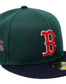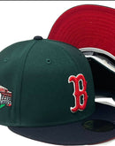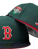 Introducing a unique custom BOSTON RED SOX 90th anniversary green brim New Era fitted hat from Sports World. The 59Fifty high crown fitted hat is designed with a sleek all dark green color cap with navy blue visor that provides a bold contrast to the classic design.