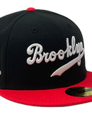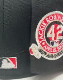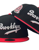 Introducing a unique custom Brooklyn Dodgers Jackie Robinson 60th anniversary gray brim New Era fitted hat from Sports World. The 59Fifty high crown fitted hat is designed with a sleek all black color cap with lava red visor that provides a bold contrast to the classic design.
