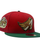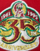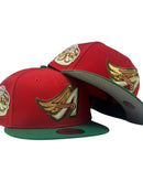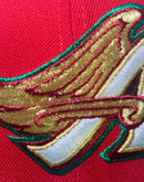 Introducing a unique custom throwback Angels 35th anniversary New Era fitted hat from Sports World. The 59Fifty high crown fitted. It features a sleek all-red color cap and a green visor contrasting with the classic design.